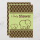 Den här toppen är en perfekt för babyduschar där babyens gender inte är känd! Utformningen har chokladbrun bakgrund med den mynta gröntens diamantkontur mönster. I mitten finns en fast mynta med brun grönt. Inuti mynta grönten finns elefant från Mor och elefant från baby, som var och en skisseras i brunt mörk. Det finns text i mörk brunt skript och fet roligt med fet stil som säger Baby Shower, men texten kan ändras om du vill. Den omvända sidan av inbjudan att duscha elefantbarn har samma bruna och grönt diamant mönster runt trimmen, men mitten är en solid mynta grönt med text i fetstilt, brun stil. Texten är helt anpassade till kostym som party behöver. Dessa inbjudningar är perfekter för den könsneutrala barnduschen eller för den person som kärlek elefanter eller planerar en barndaghem i baby.