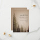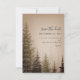 En elegant bröllopsinbjudan med en illustration av ständigt gröna träd över en brun bakgrund.
