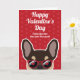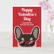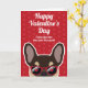 Franskbulldoggar, skicka ett valentinskort till din ägare bara från dig. Designen visar en illustration av en söt brun och tan-färgad fransk bulldog med röda solglasögon på en röd bakgrund med ett subtilt hjärtmönster. Texten på framsidan lyder "Glad Alla Hjärtans Dag från den du älskar mest" men kan ändras. Texten på insidan lyder "Jag älskar dig svansförnuftigt" men kan också ändras.