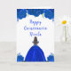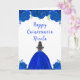 Denna Quinceanera födelsedagskort har falskt glitter kunglig blå blomster och en vacker prinsessa med brunt hår och en elegant klänning. Detta är perfekt för en Quinceanera födelsedagsfest.