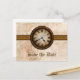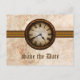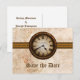 Denna antika klocka "Save the Date"- vykort har ett vintage ur som är centrerat ovanpå en metallkulkedja och en snygg rostbrun rand med ränder. Det slitna utseendet på den grungiga pappersstrukturen i bakgrunden kompletterar den antika känslan av denna unika design. Detta avvikande "save the date"-vykort är perfekt för att tillkännage ditt vintage- eller steampunk-inspirerade bröllop. Lätt att anpassa, lägg bara till dina bröllopsdetaljer i de medföljande fälten. Klicka på "Anpassa" för att hitta ytterligare alternativ för att anpassa denna design.