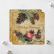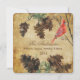 Ett vackert julkort att skicka till alla dina vänner och familjemedlemmar, har ett fyrkantigt kort med rundade hörn med en brun texturerad bakgrund, tallkottar, trädgrenar, en röd kardinal och anpassningsbar text som lyder God Jul önskar på framsidan, samma bruna texturerade bakgrund, tallkottar, röd kardinal och grenar med ett anpassningsbart område för att lägga till ditt efternamn, förnamn och innevarande år på baksidan.