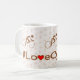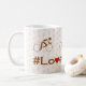 Brun text med rött hjärta, och tre piktogramcyklister över, på en neutralt färgad bakgrund som har mönster av ek löv (för ett land-tema). En mugg för alla som gillar att gå på cykel. Njut inte bara av cykling: #LoveCycling!
