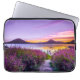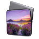 Brunt trädocka mellan lavenderblomman fält laptop fodral