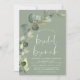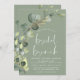 Eucalyptus Greenery Succulent Botanical Watercolor Vår Sage Grönt Bröllop Möhippa - Möhippa Brunch inbjudningar på vit bakgrund - innehåller vacker och elegant manustypografi med moderna botaniska löv och grön för att speciella Briden ska vara firande.