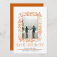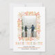 Bröllopet Spara datum meddelande faller i Berries och löv gräns. På framsidan finns en ram som består av bär och löv, texten "Spara datum" i ett färgstarkt teckensnitt och ett foto. Baksidan är av fast bränd orange färg.