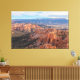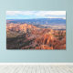 A breathtaking panoramic view of Bryce Canyon National Park, showcasing its iconic hoodoos and amphitheaters. The warm, golden light of sunrise illuminates the orange and red rock formations, casting long shadows across the landscape. Pine trees dot the slopes, adding a touch of green to the arid terrain. In the distance, layers of mountains fade into a hazy blue horizon under a sky with scattered clouds.
