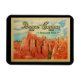 Vintage resor stil Bryce Canyon nationalparksbild med berömdens höga hodoos som når fram till ett puffblått moln himlar.