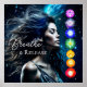 Fredlig ai-konst som skildrar en vacker kvinna med hårblåsning i vinden och en söt blå himmelsblå eterisk bakgrund. Citat, "Breathe and Release". Söt belyste chakras andlig art.