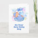 Skicka dina glatta grattisar när du föder en nyfödd bebis-pojke med det här hälsningskortet med en söt nalle som sover i blått sling medan du flyter i himlar med ballonger.