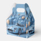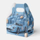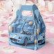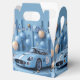 Födelsedagsfesten beställer lådor med coola blå tävling-bil och blå och beige ballonger. Bakgrunden är en söt blå med guld-stjärnor och ballonger.
