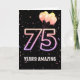 Party-ballonger och konetti mot svart bakgrund med neonnummer 75 för en 75:e-födelsedag.