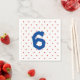 Utformningen har mönstrat bilder av ballonger och konfekt mot en vit bakgrund. Barnets ålder visas i ljusblått i mitten.