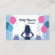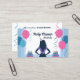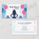 Ett party-planeraraffärskort med en silhuett av en kvinna med långt hår och en party hatt. Hon står i ett rum med ballonger, vrider, kakor och bakgrunden är en ljusblå övertoning. Det kommer att vara perfekt för inbjudningskort eller för organisatörer av party som födelsedagsfest för barn eller vuxnor, produktlanseringar, babydusch, familjejordbruk, firande, bröllop-årsdag, reklamfest, temaparty osv.