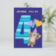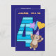 Det här är en färglös födelsedagsfest inbjudan-design, med en blå och teal stripe nummer fyra, och en söt brun apa i en födelsedagshatt och med ballonger framför den. Överst på inbjudan står att (Namn) kommer att vara (fyra). Bilden och texten placeras på en ljus lila bakgrund. Kortets baksida är samma lila, med information om party i vitt. Underbart för ditt barns fjärde födelsedagsfest! *Tack vare Real Deal Clipart för det klipp som används för att skapa den här designen.