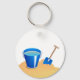 Illustration av en barn-bucket och spade som vilar i sanden på stranden. Bucket är fullt i vatten. Finns på olika produkter och presenter.