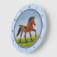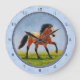 Vild-buckskin-häst galloping över en grasslig slam. Med en söt himlar blå mönstrad bakgrund.