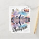Fånga den förtrollande skönheten i Budapest med detta fantastiska akvarell-inspirerade vykort. Med mjuka, flytande penseldrag och levande färger framhäver designen stadens ikoniska landmärken, inklusive det majestätiska parlamentet och Kedjebron, mot Donaufloden. Perfekt för konstlängare, resenärer och samlare, detta vykort ger Budapests charm liv.