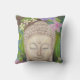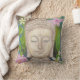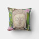 Buddha statyansikte med färgrika blommor på en dekorativ kudde.
