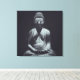Ett gråskalefoto fångar en serene Buddha-staty som sitter i en meditativ attityd mot mörkens bakgrund.