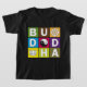 BUDDHA stavas ut i denna färgrika och original- Buddha design i mångafärgkvarter! Buddha text med tre buddismsymboler, Dharmaen rullar, det Yin Yang symbolet, och lotusblommarna blommar. Underbara buddismskjortor och gåvor för buddister!