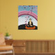 Buddha sitter på en orange-lotus blomma när lila och rosa hjärtan flödar från hans öppna hand! Rosa och lila regnbåge och blå himmel bakgrund! Underbar och fredlig buddism poster! Buddha överflödar med kärlek och medlidande!