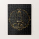 Buddha Mandala Design med en illustration av en buddha i form av en mandala i guldsparkade linjer.