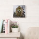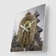 10,75 x 10,75-tums akrylväggklocka med en bild av en brun och guld buddha-mask på en bakgrundsbild av en grått-dag och ett Balinesiskt tempel. Orberna i silver markerar de 12, 3, 6 och 9 positionerna. Se hela uppsättningen av Enlightenment Clock i DÉCOR | Facksektionen.