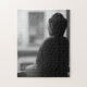 Vårt eget svarta och vita foto av en Buddha-staty sitta i lotus läge som mediterar när han blickar ut ett fönster. Underbar för hälsa-affärskort eller gåvor till buddisten.
