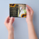 Elegant chic sommar- eller höstbröllop stilfullt BUDGET prisvärt tack PAPPER FLYER-mall på mörkbrun lada med vackra solrosbuketter, slingor eller gnistrande ljus och ett chic falskt guldkalligrafiskrift. ++++++++++++++ Lätt att anpassa med dina detaljer och två foton på framsida och baksida! +++++++++++ Lämplig för elegant sommar- eller höst rustic landsbygd utomhus bakgård eller ladbröllop. ++++++++++++++++++++++++ VÄNLIGEN LÄS DETTA INNAN KÖP! Detta är ett budgetprisvärt kort som trycks på en FLYER. ++++ Observera att BUDGETPAPPER ÄR TUNNT - Du kan uppgradera till att få detta kort tryckt på kartong ++++ KUVERTER INTE MEDFÖLJANDE. +++ Dubbelkontrollera all information och stavning av din text eftersom du kommer att få exakt vad du ser - ingen annan kommer att kontrollera någonting innan tryckning. ++++ Detta kort är designat för storlek 4,