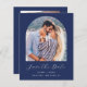 Den här enkla, minimalistiska Spara datumkortet har en boho-fotobåge ovanför orden "Spara datum" i ett vitt handskriftsskript i elegant, följt av parets namn, bröllop datum och stad i sans serif-teckensnitt på en marin blå bakgrund. Lägg till ett foto för vågrät och ett mer detaljerat meddelande med ytterligare information på baksidan.