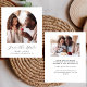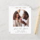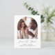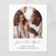 Den här enkla, minimalistiska Spara datumkortet innehåller en boho-fotobåge ovanför orden "Spara datum" i elegantens svarta handskriftsskript, följt av parets namn, bröllop datum och stad i sans serif-teckensnitt på vit bakgrund. Lägg till ett andra foto med vågrät och ett mer detaljerat meddelande med ytterligare information om det omvända.