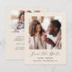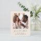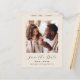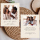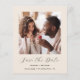 Det här enkla, minimalistiska Spara datumkortet innehåller ett fyrkantigt foto ovanför orden "Spara datum" i ett vitt handskriftsskript i elegant, följt av parets namn, bröllop datum och stad i sans serif-teckensnitt på en beige bakgrund. Lägg till ett andra foto med vågrät och ett mer detaljerat meddelande med ytterligare information om det omvända.