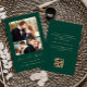 Denna enkla, minimalistiska "Spara datum"-kort har en fotokollage med ett horisontellt foto högst upp och två fyrkantiga foton nedanför. Orden "Spara datum" visas i elegant, guldfärgad handskriven text följt av parets namn, bröllopsdatum och stad i sans serif-teckensnitt på en smaragdgrön bakgrund. Lägg till ett mer detaljerat meddelande med ytterligare information på baksidan, tillsammans med en QR-kod som hjälper dina gäster att besöka er bröllopswebbplats.