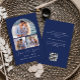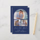 Den här enkla, minimalistiska Spara datumkortet har en skiftformad fotokollage, med ett vågrät foto på två mindre fyrkantiga foton. Under orden "Spara datumet" visas ett vitt handskriftsskript i elegant, följt av parets namn, bröllop datum och stad i sans serif-teckensnitt på en marin blå bakgrund. Lägg till ett mer detaljerat meddelande med ytterligare information på baksidan, tillsammans med en QR-kod som hjälper dina gäster att besöka webbplatsen för bröllop.