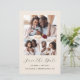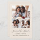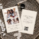 Den här enkla, minimalistiska Spara datumkortet har en 3-fotokollage, med ett vågrät överst och två fyrkantiga foton nedanför. Orden "Spara datum" visas i elegantens svarta handskriftsskript, följt av parets namn, bröllop datum och ort i sans serif-teckensnitt på en beige bakgrund. Lägg till ett mer detaljerat meddelande med ytterligare information på baksidan, tillsammans med en QR-kod som hjälper dina gäster att besöka webbplatsen för bröllop.