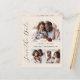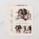 Den här enkla, minimalistiska Spara datumkortet har en fotosamlingsplats, med ett foto överst och två kvadratiska foton i grund. Orden "Spara datumet" springa vertikalt ökar den lämnat marginalen i elegantens svarta handskriftsskript. Parets namn, datum och stad i bröllop visas mellan fotona i sans serif-teckensnitt på en beige bakgrund. Lägg till ett fjärde foto med vågrät och ett mer detaljerat meddelande med ytterligare information på baksidan.