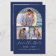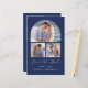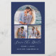 Den här enkla, minimalistiska Spara datumkortet har en skiftformad fotokollage, med ett vågrät foto på två mindre fyrkantiga foton. Under orden "Spara datumet" visas ett vitt handskriftsskript i elegant, följt av parets namn, bröllop datum och stad i sans serif-teckensnitt på en marin blå bakgrund. Lägg till ett fjärde foto med vågrät och ett mer detaljerat meddelande med ytterligare information på baksidan.