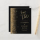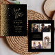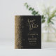 Det moderna bröllop spara datum-kortet från elegantens lämnat kant har ett faux glitter gräns. Anpassadet kombinerar handskrift, formatmall och kursivt typsnitt med guld-färgad mot svart bakgrund. På baksidan finns blanksteg för 4 foton (1 kvadrat, 2 vågrät, 1 långt lodrät) och plats för webbadressen för bröllop eller annan information.