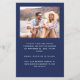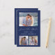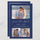 Det här enkla, minimalistiska Spara datumkortet innehåller ett foto i vågrät överst och två kvadratiska foton i grund. Mellan visas orden "Spara datum" i ett vitt handskriftsskript i elegant, följt av parets namn, bröllop datum och stad i sans serif-teckensnitt på en marin blå bakgrund. Lägg till ett fjärde foto med vågrät längst bak, tillsammans med ett mer detaljerat meddelande med ytterligare information.