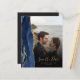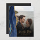 Den vänstra kanten på detta eleganta moderna bröllopskort i "save the date"-stil har en akvatint akategräns i marinblå med falskt guldglitter. Den anpassningsbara texten överlagras med guldfärgad handskriven script och kopparplåtstypsnitt över ett foto som du väljer. Ett svart övergångsfilter hjälper till att få texten att sticka ut. Baksidan har utrymme för fyra ytterligare foton (en fyrkantig, två horisontella och en vertikal) tillsammans med plats för din bröllopswebbadress eller annat kort meddelande i guldfärgad text på en svartaktig bakgrund.