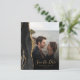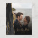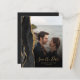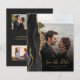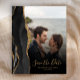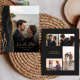 Den vänstra kanten på detta eleganta moderna bröllopskort "save the date" har en svart akvatintstenkant med falskt guldglitter. Den anpassningsbara texten överst kombinerar guldfärgad handskriven stil och kopparstick-font på ett foto som du väljer. Ett svart gradientfilter hjälper till att få texten att sticka ut. Baksidan har utrymme för fyra ytterligare foton (en fyrkantig, två horisontella och en vertikal), tillsammans med plats för din bröllopswebbadress eller annat kort meddelande i guldfärgad text på svart bakgrund. OBS: Kuvert ingår inte automatiskt med dessa budgetinbjudningar, så glöm inte att välja alternativet "tomma vita kuvert"!