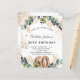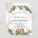 För en 60:e födelsedagsfest. En vit bakgrund som dekorerats med eukalyptus greenery och gyllene löv. Golden Faux glitter-fläckar. Anpassa och lägg till information om namn och bröllop. Svart och guldfärgad färgad brev. Teckennummer 60 skrivs med stil som ballong. Baksida: vit bakgrund och gyllene faux glitter-fläckar.