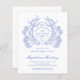En elegant fransk vintage blå blommig vapensköld tar centrum på denna tidlösa födelsedagsinbjudan. Ornamenterad, formell och mycket feminin gör vilken födelsedagsdam som helst mycket speciell. Koordinerande festtillbehör finns tillgängliga.