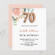 En inbjudan till elegant för en 70:e födelsedagsfest. En vit chic bakgrund. Dekorerad med en ro guld och en rosa vattenfärgad blomma, blommigt, grönt eucalyptus löv, spriter, grönsaks- och faux ro sprigs. Personalisera och närmare uppgifter om namn och party. Svarta och gyllene brev. Namn är skrivet med ett modernt handskript i stil. Nummer 70 är skrivet med ett gyllene stil-typsnitt. Bakåt: ro guld, färg.