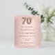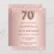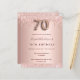 En modern, stilfull och glamourös inbjudan till en 70-årsfest. En falsk roséguld metallisk bakgrund med en elegant falsk roséguld glitterdropp, målarfärgsdropp-look. Namnet skrivs med en modern mörk roséguld färgad handskriven stil. Personifiera och lägg till dina festdetaljer. Nummer 70 skrivs med en ballongstil font, script.
