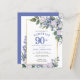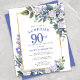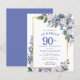 Hedra en speciell kvinna med denna eleganta och feminina Budget 90-årsfirande Överraskningsfest inbjudan. Överraskning och 90-års är skrivna i stor blå text. Födelsedagsfirande följer. Den hedrade gästens namn är också i blå versaler. Födelsedagsfirandets detaljer är omgivna av en chic guldram. De blå blommorna och vita rosorna är boende i djupt gröna blad.