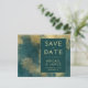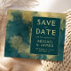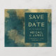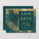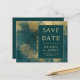 Detta eleganta bröllop Save the Date-kort har en modern tealblå och guld abstrakt akvarellbakgrund. Anpassa den guld färgade texten i snygga typsnitt på en mörk teal rektangel och lägg till er bröllopswebbadress på den enfärgade teal baksidan.