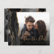 Detta eleganta horisontella spara-datum-kort har en svart akvarellfärgad agat-kant med falskt guldglitter. Byt enkelt ut exempelbilden mot ditt eget foto av den blivande bruden och brudgummen. Den anpassningsbara texten kombinerar guldfärgad handskriven skrift och kopparplåtsskrift; en svart gradientfilter hjälper till att få texten att sticka ut. Baksidan har en matchande svart och guld agat-design.