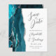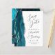 Den vänstra kanten på detta eleganta moderna bröllops klara datum-kort har en tealblå akvatint kant trimmat med falskt silverglitter. Den anpassningsbara texten kombinerar kolgrå handstil, kopparplåt och kursiv stil på vit bakgrund. Baksidan har en matchande teal och silver agatdesign.
